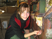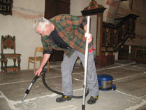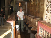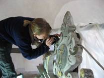 Vid predikstolen arbetar Nadine Huth, från Byggnadshyttan. Nadine är träkonservator och hon håller på med rengöring och hon fäster också färg som har lossnat. För det arbetet använder hon en särskild mjuk svamp.