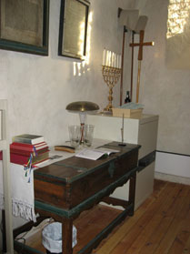 Ljusbäraren framför pelaren med den återuppsatta ljuskransen