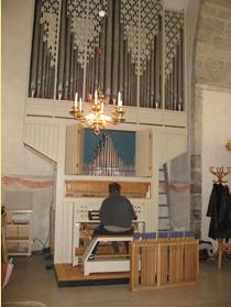 Den här dagen låter det entonigt från orgeln i kyrkan. Det är orgelbyggarna Monica och Tomas Svenske som håller på att stämma orgeln. Hela orgeln har varit nedmonterad och har nu satts upp igen. Den har nu fått en ny placering i kyrkan och efter en grundlig översyn är den nu färdig att tas i bruk. |