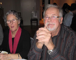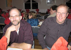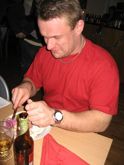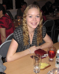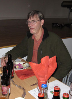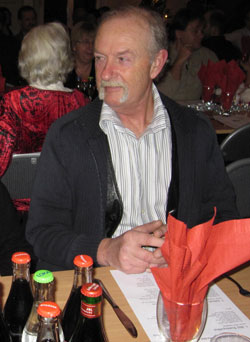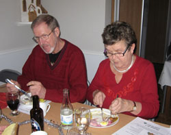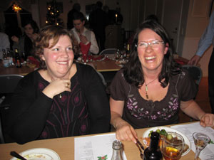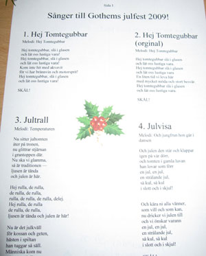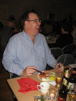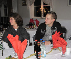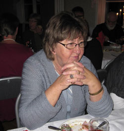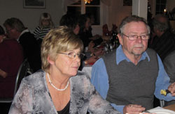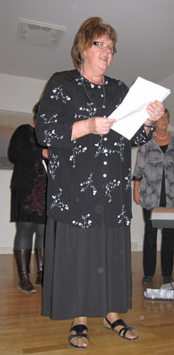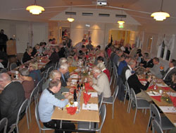 | Under kvällen sjöngs snapsvisor och annat från ett fint sångblad som fanns utlagt på borden. Maria Lööw ledde som vanligt sången med bravur. Åsa Karlsson framförde ytterligare flera specialskrivna limerickar under kvällen. Ett mycket uppskattat inslag. |