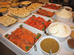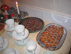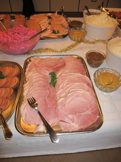 Allt vad man kan tänka sig på ett rejält julbord fanns uppdukat i bygdegårdens kök där alla kunde förse sig. Där fanns, sill, ägg, skinka, pastejer, rökt och gravad lax, sallader av olika slag, Janssons frestelse, köttbullar, prinskorvar, brysselkål, dopp i gryta, gotlandsdricka, risgrynsgröt, ostkaka, konserverade päron med grädde, kaffe, pepparkakor och hemlagat julgodis m m. Det fanns mat i riklig mängd och den som inte blev mätt har bara sig själv att skylla. |