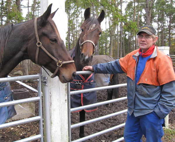 Gunnar Hermansson med två av sina travhästar Freedom Margunn och Anna Margunn. Båda hästarna har Gunnar själv fött upp och Freedom Margunn är den vinstrikaste hittills. Gunnar har sex travhästar i det välskötta stallet vid Botvalde.