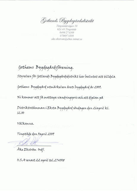 Brevet från Gotlands BygdegårdsdistriktI brevet stod att Gotlands Bygdegårdsdistrikt tilldelat Gothems Bygdegård utmärkelsen Årets Bygdegård år 2009. Det är 10:e året som utmärkelsen delas ut.