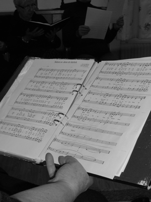 I pausen intas allt från kaffe till äpple eller ett glas vattenUnder Fikapausen frågar jag körmedlemmarna varför dom sjunger i kör? Jag har sjungit i kör i 50 år säger Gunbritt Andersson, missar jag en torsdag känns det nästan som om det var en månad sen jag sjöng, jag älskar det här. Alla är rörande överens, att sjunga är roligt det ger en enorm glädje och man går hem glad efter varje övning det blir som en själslig rensning. I musik finns gemenskap och den har en terapeutisk förmåga. Svaren är många men alla landar dom i samma fack om hur otroligt roligt och givande det är att vara med i kören.