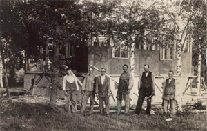 Bild från bygget av kapellet i Gothem 1911-1912. Tredje från vänster Alfred Stenström, Karl Lindahl, längst till höger Aug. Olsson.