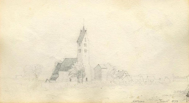 På Krigsarkivet i Stockholm förvaras teckningar av Fredrik Arosenius (1819-1890), han var Överstelöjtnant och Krigsarkivarie. I juni 1833 var han i Gothem och gjorde en teckning av Gothem kyrka. Han reste runt i hela Sverige och tecknade, från Gotland finns motiv på Visby Ringmur och från Katthammarsvik, samt denna teckning från Gothem.