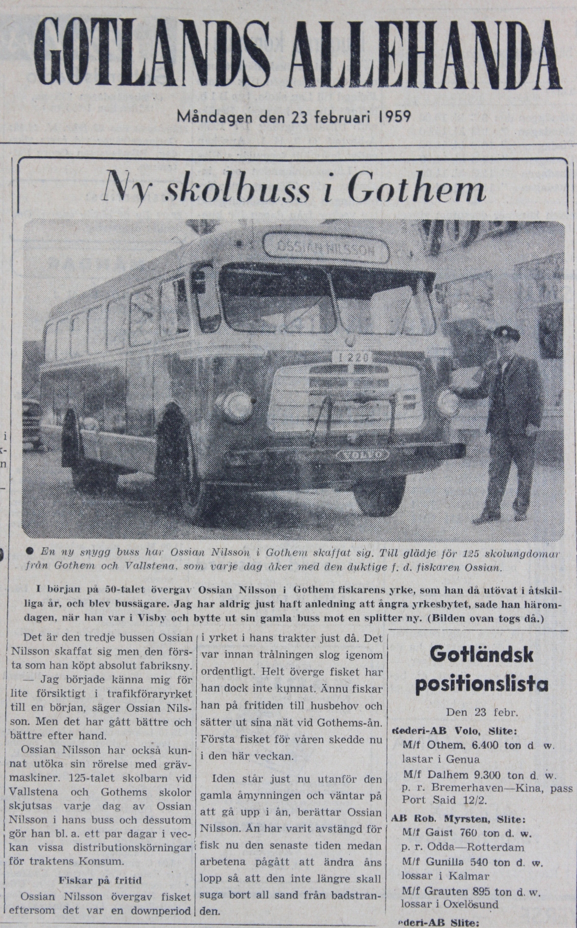 I februari 1959 fick Gothem en ny skolbuss. Då köpte busschaufför Ossian Nilsson sin tredje buss, en Volvo B 70503, som var absolut fabriksny. Bussen finns troligen kvar ännu idag, den visades upp vid Visby busstation i juni 2009 när Gotlandsbuss tog över efter Swebus på Gotland.