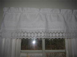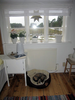 Hennes moster Berit Lindgren har hjälpt henne att sy gardiner av mormorsmor Idas brudnattlinne. Hennes sovrum är ljust och fint och också katterna har en egen säng där.